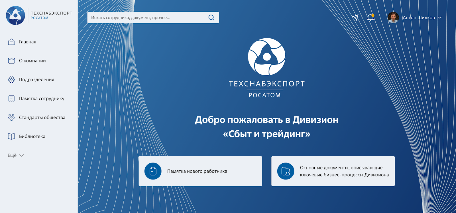 Приветственная страница. С нее пользователь сразу может перейти в один из двух разделов памятку для нового работника или получить информацию об основных бизнес-процессах. Оба разделы актуальны для новых сотрудников, а их расположение на главном экране помогает им сразу погрузиться в знакомство с работой.